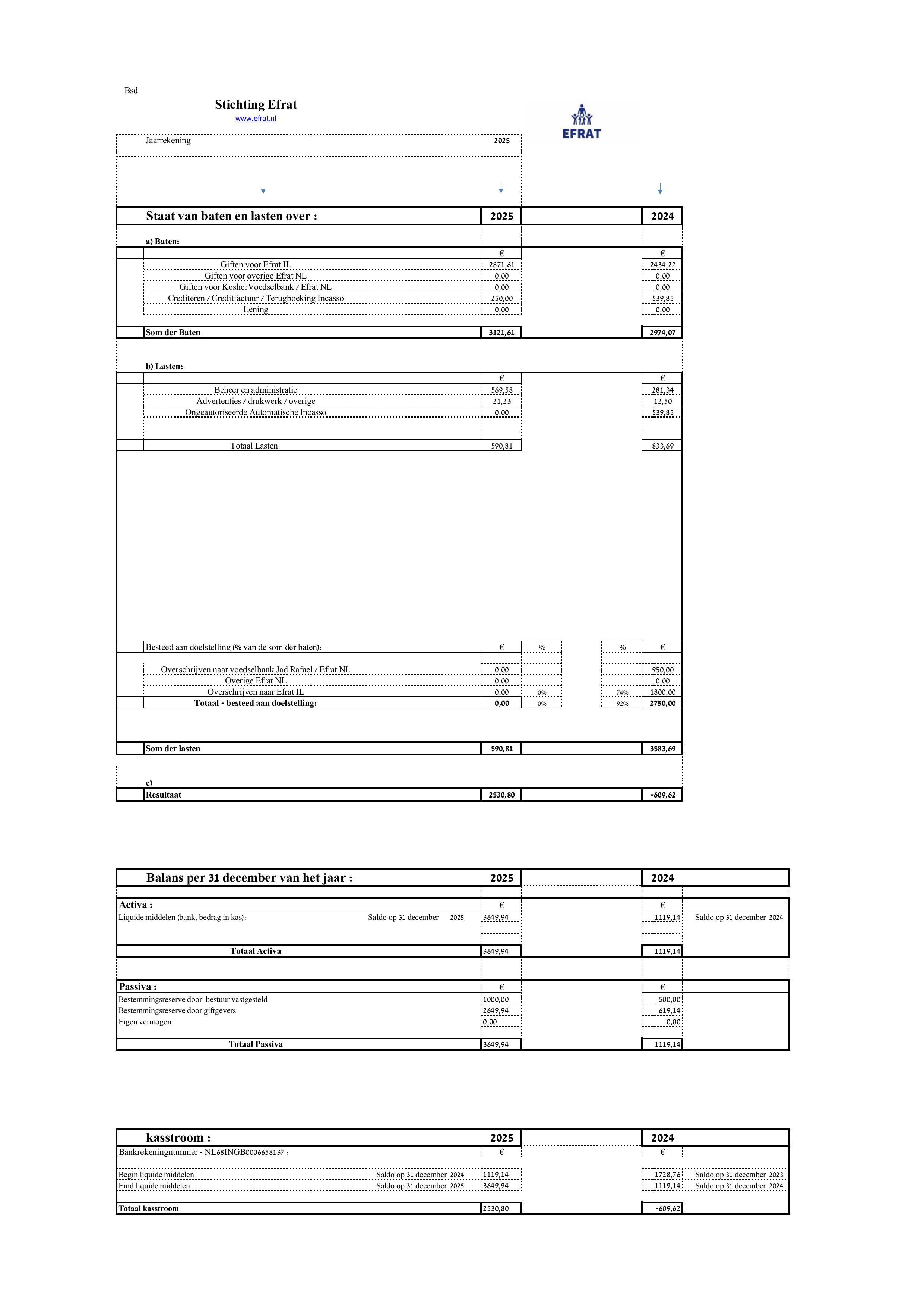 Uit onze jaarrekening-/en is af te leiden dat de enige geld die naar het buitenland werd overgemaakt is de overschrijving-/en naar EFRAT IL. U kunt het verslag van EFRAT IL over het gebruik ervan hier downloaden.